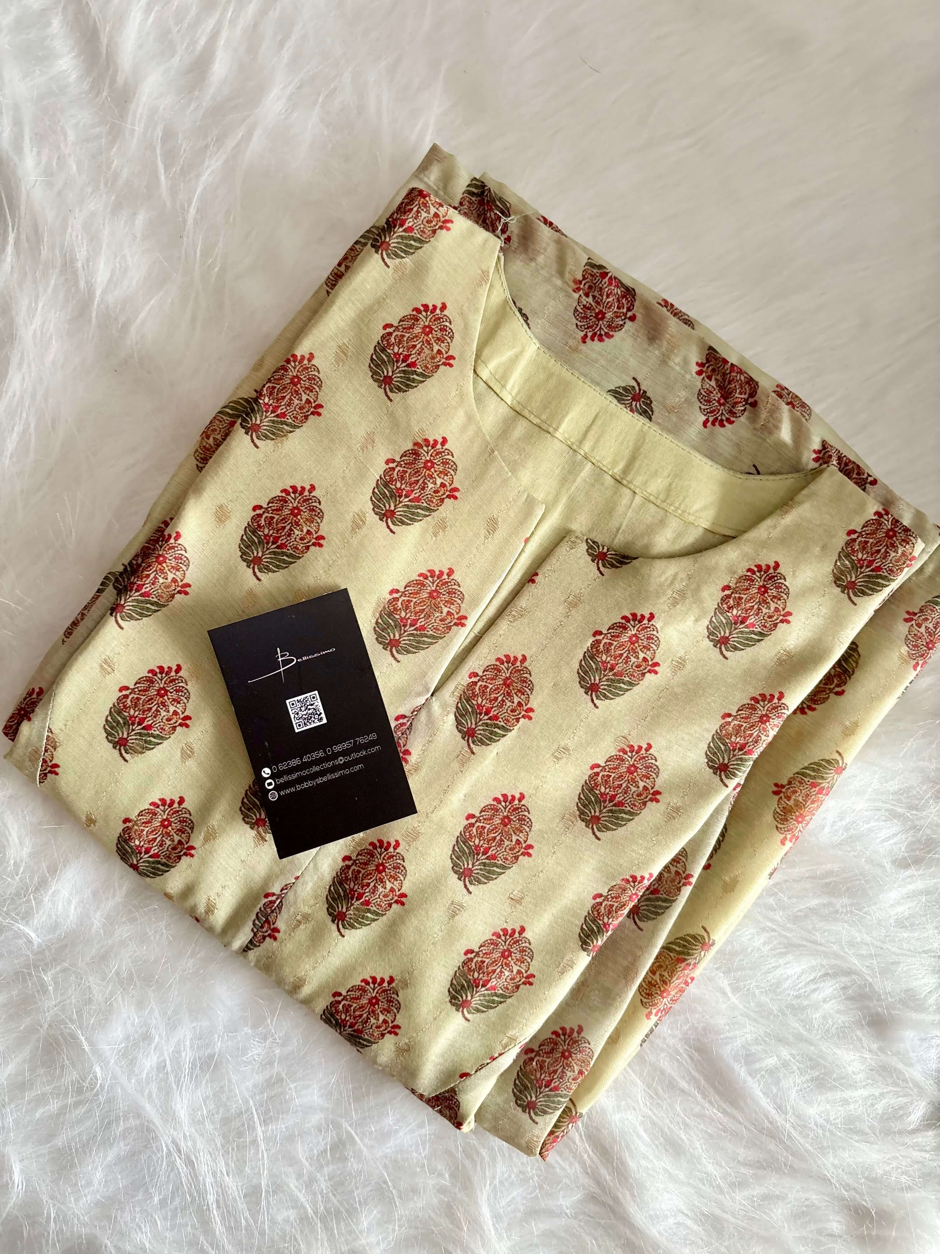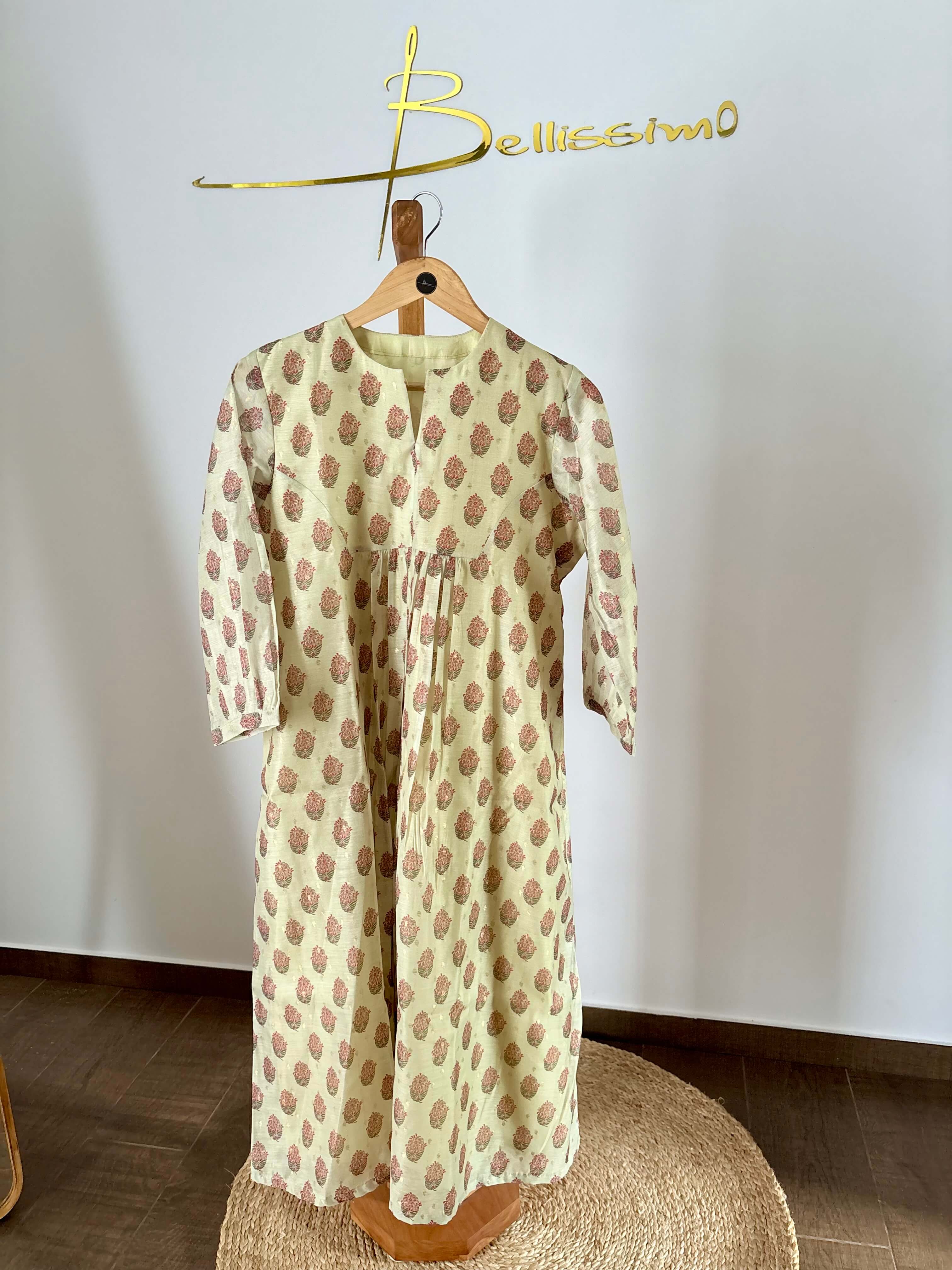 Chic in Chanderi ✨ A soft Chanderi dress with elegant floral prints and gentle gathers — perfect for a graceful, light party look with a traditional touch.