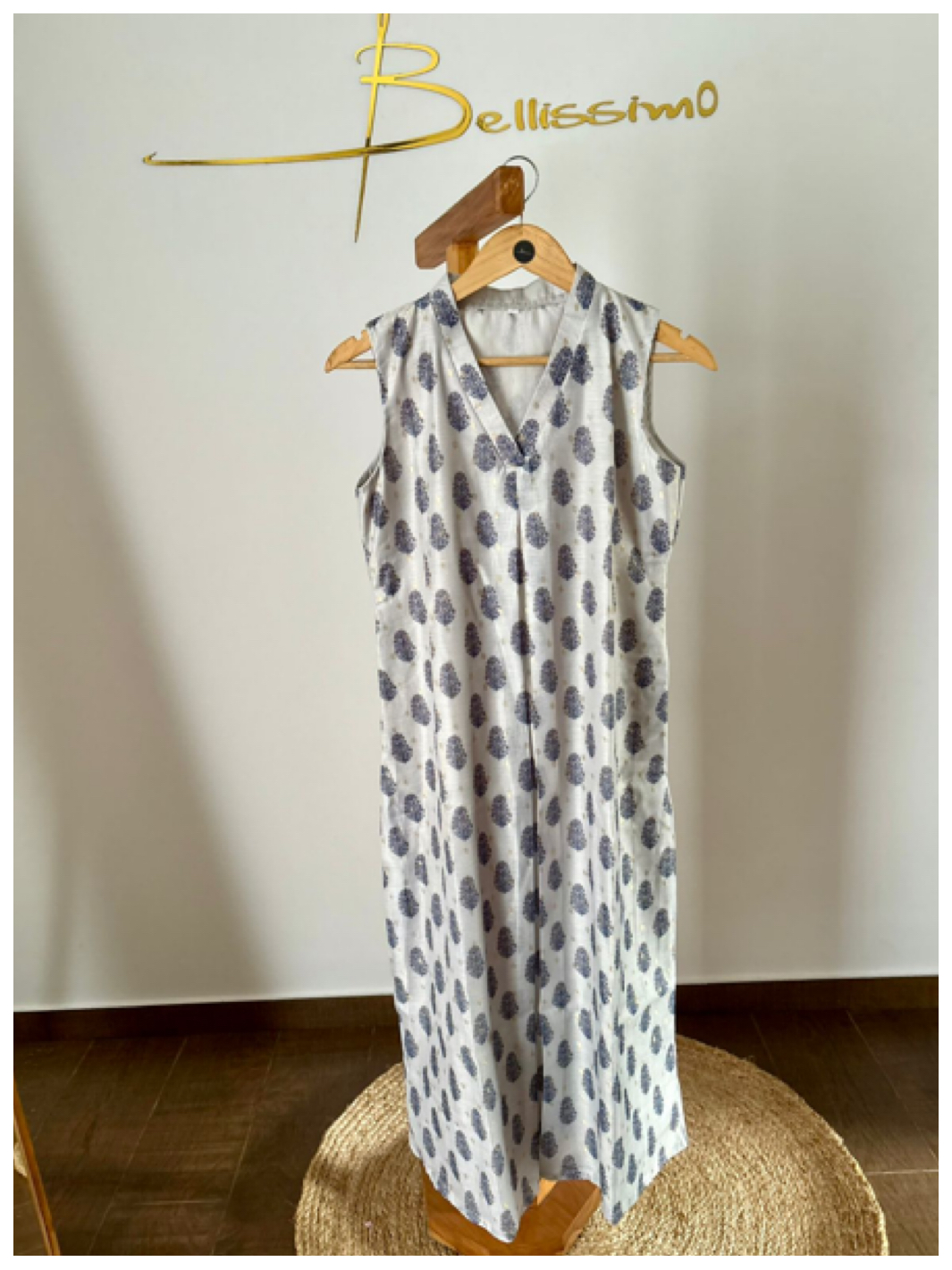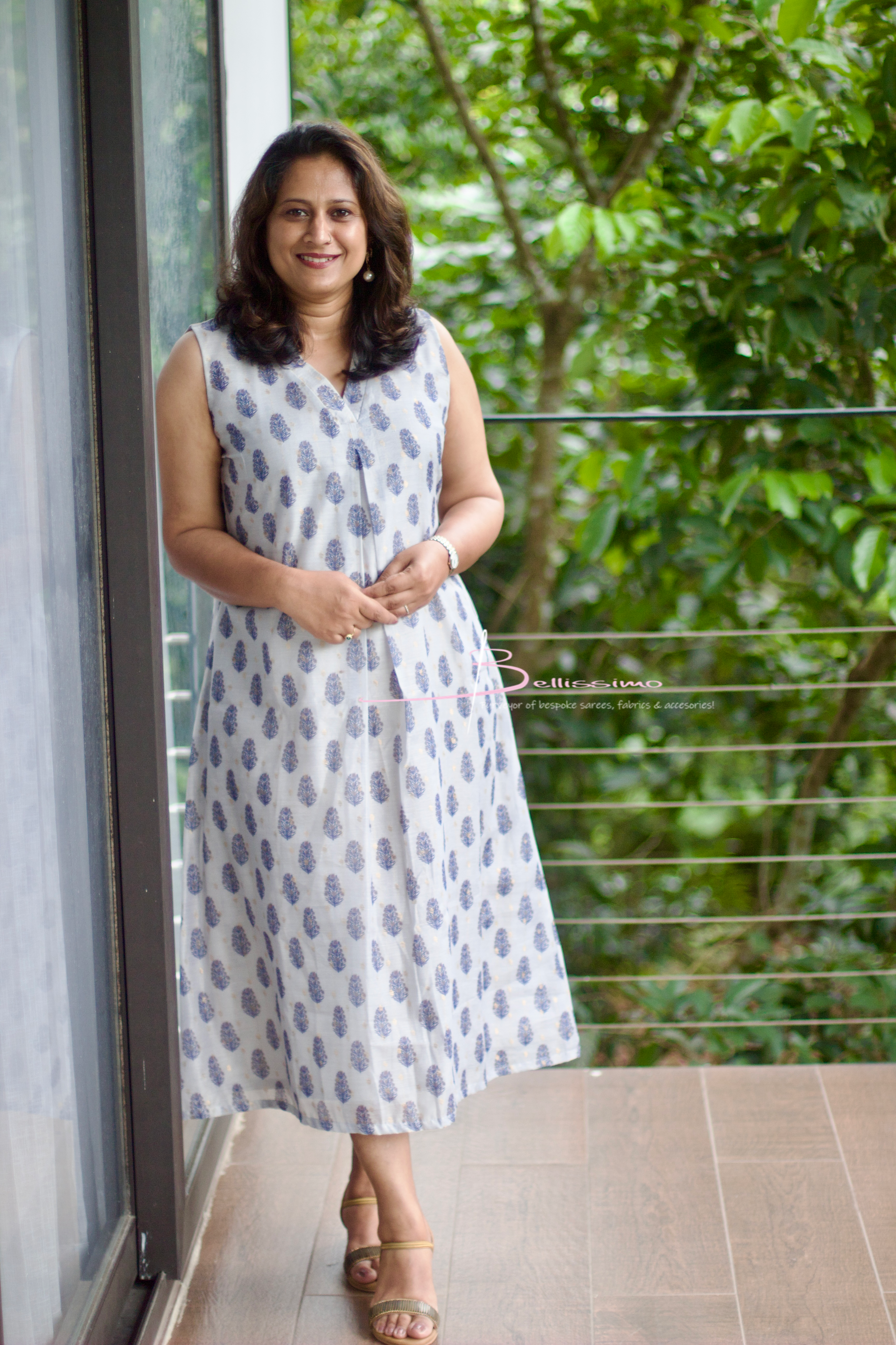 Subtle Shine, Everyday Grace ✨ Sleeveless Chanderi dress in soft white with delicate blue prints — lightweight, breathable, and perfect for effortless daytime elegance.