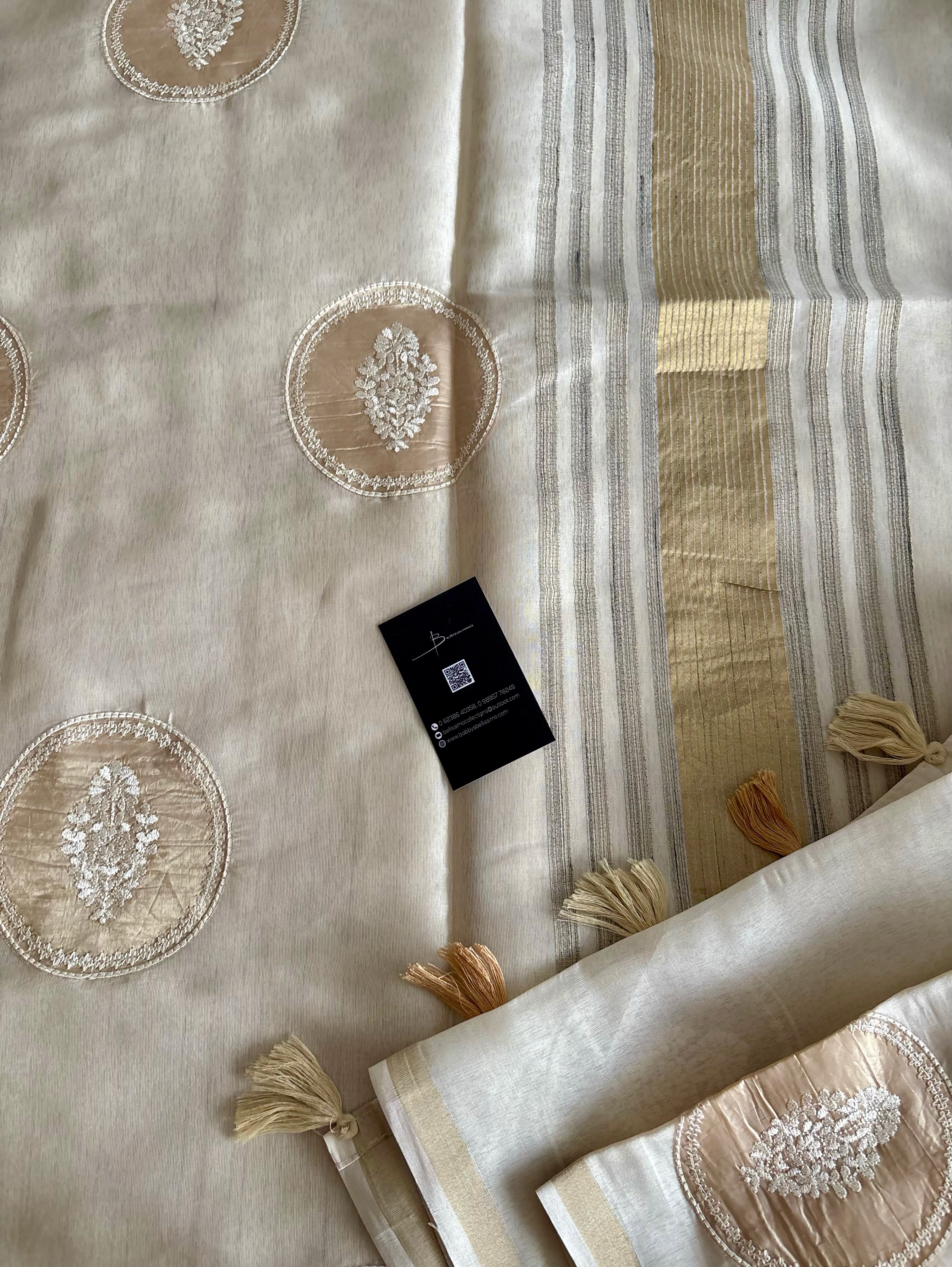 Our Tissue silk embroidered saree with rich pallu and delicate motifs all over — perfect for weddings and traditional occasions.