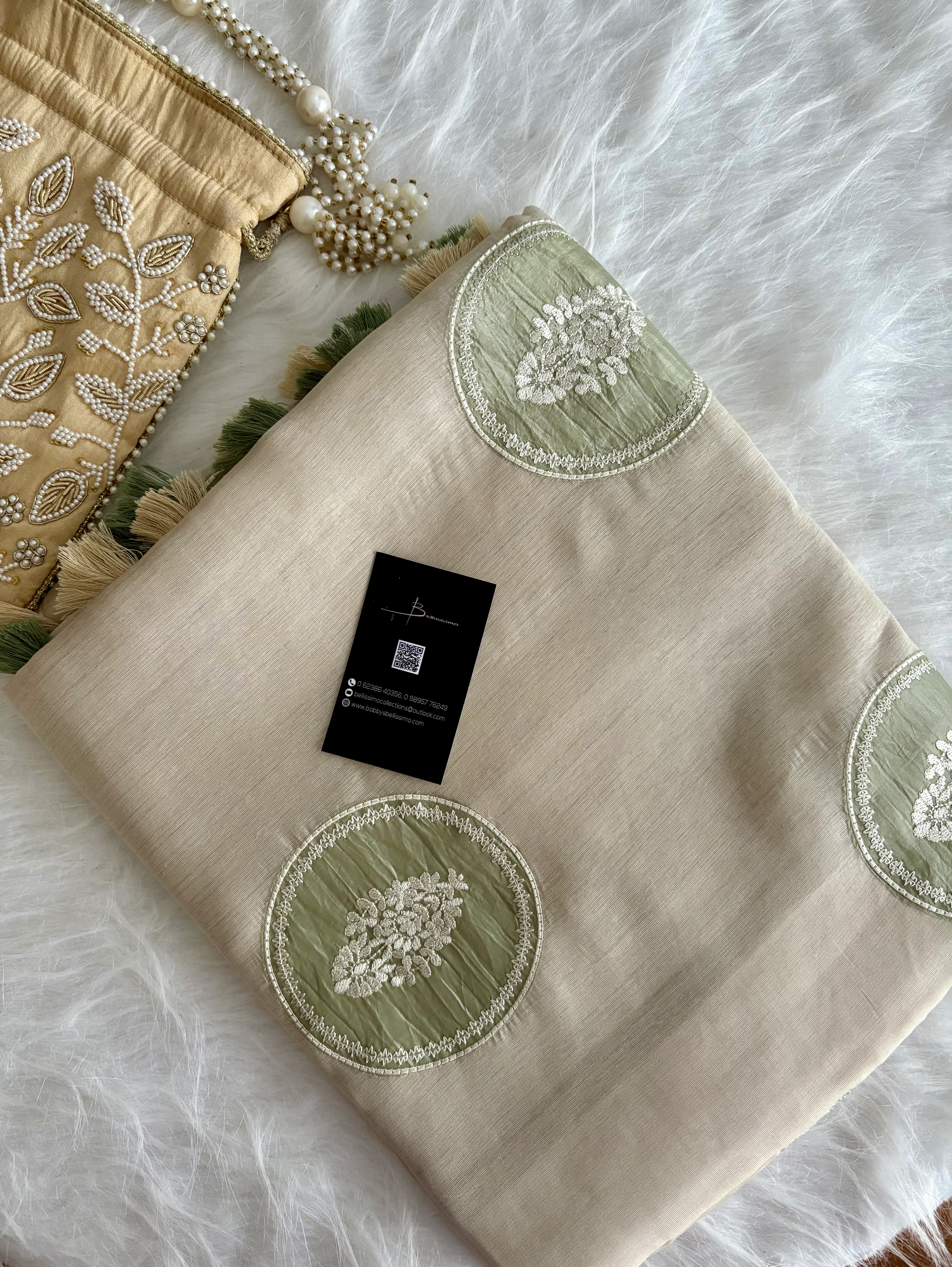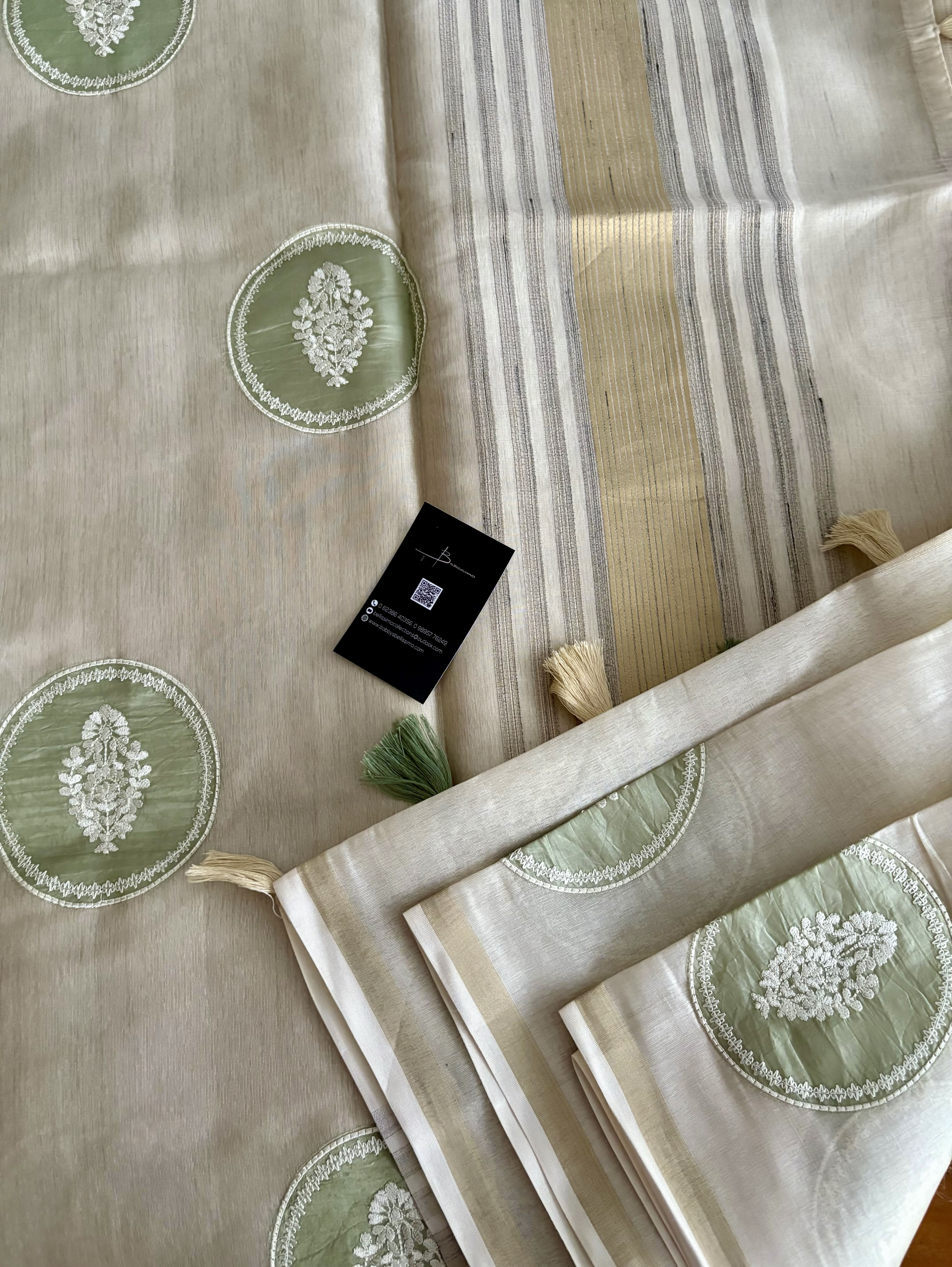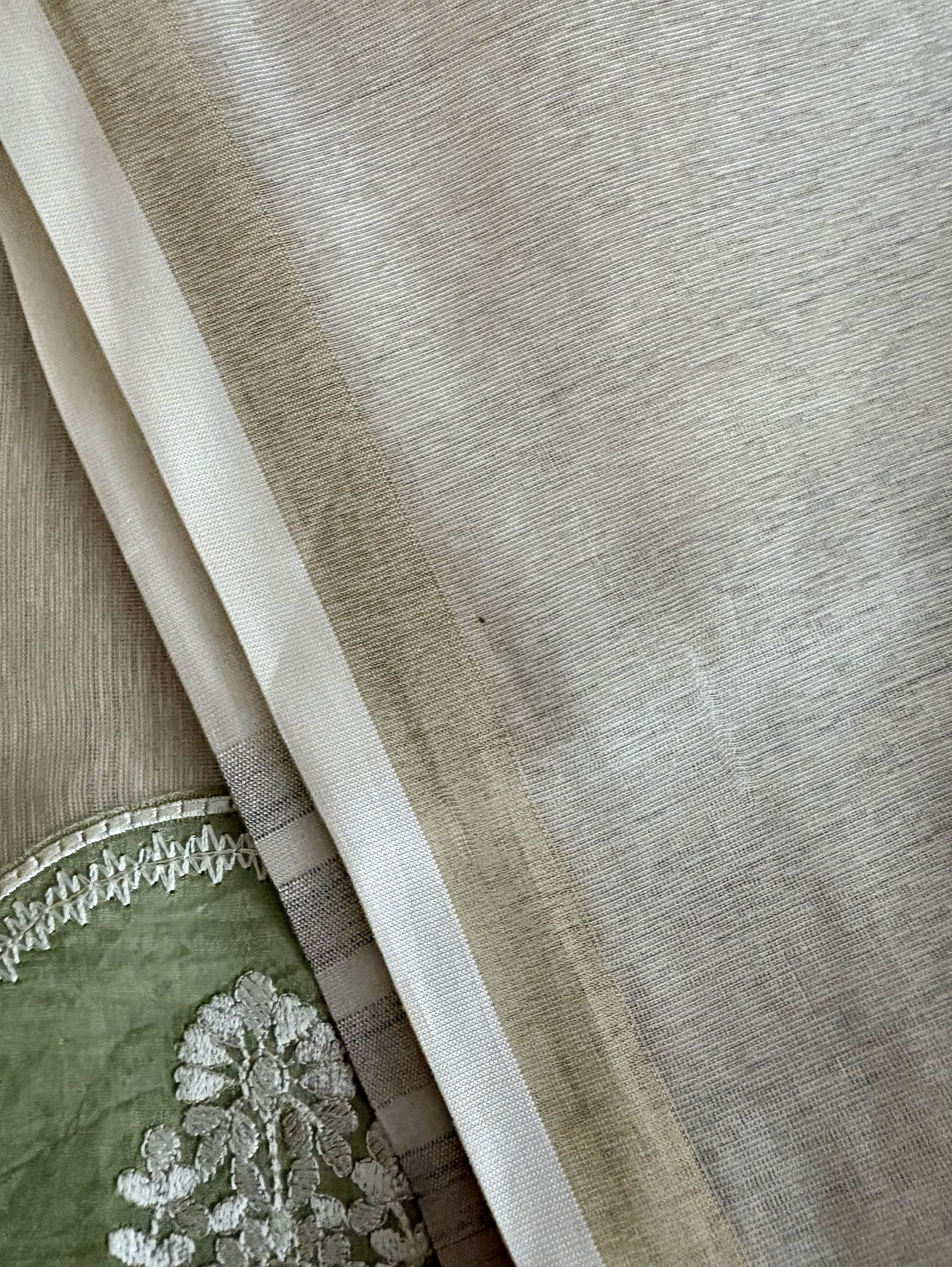 Elegant tissue silk saree with delicate embroidery in sage green shade. Saree with same shade blouse.