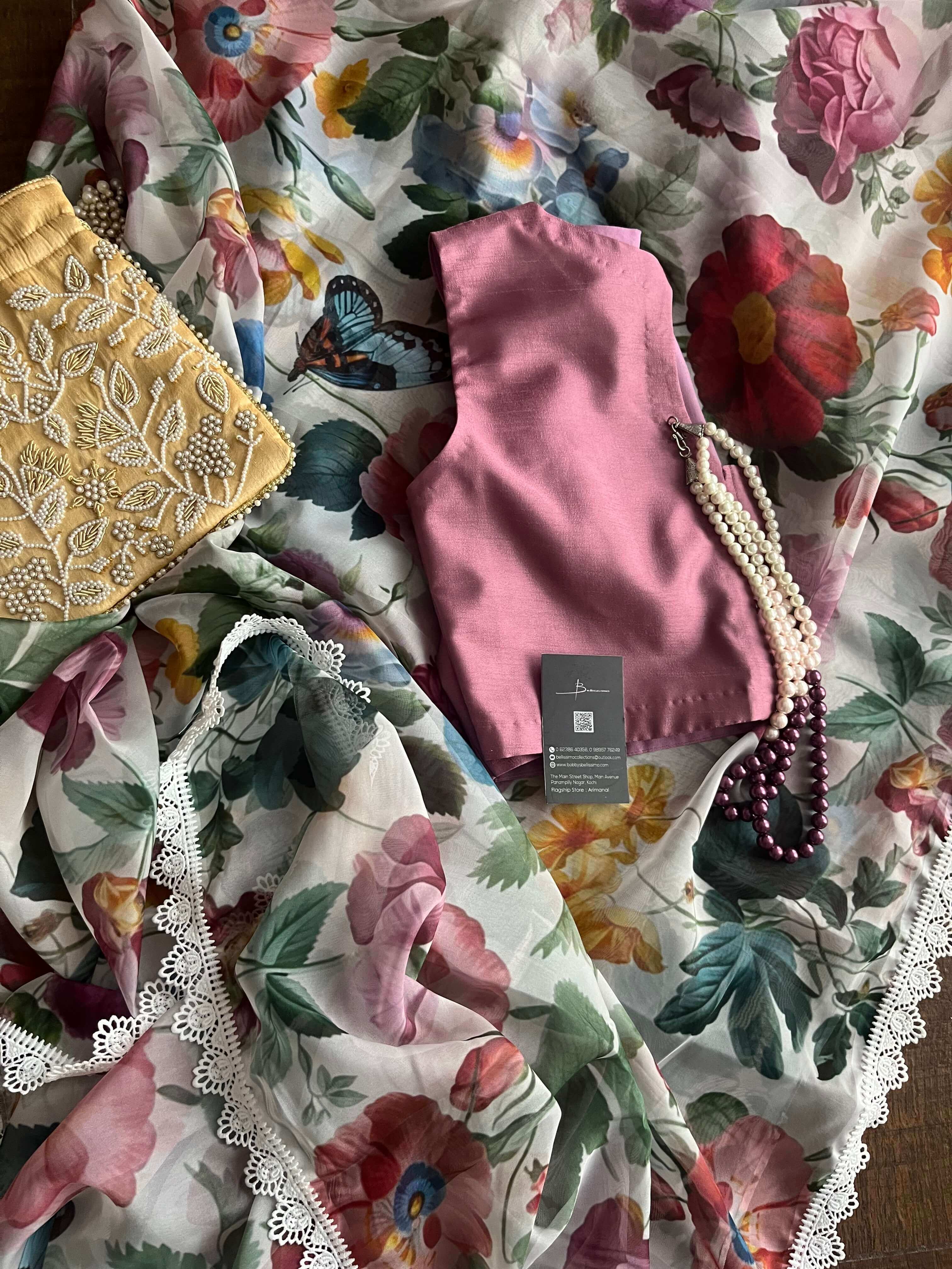 Soft Organza saree with crochet lace as border. Blouse silk base
