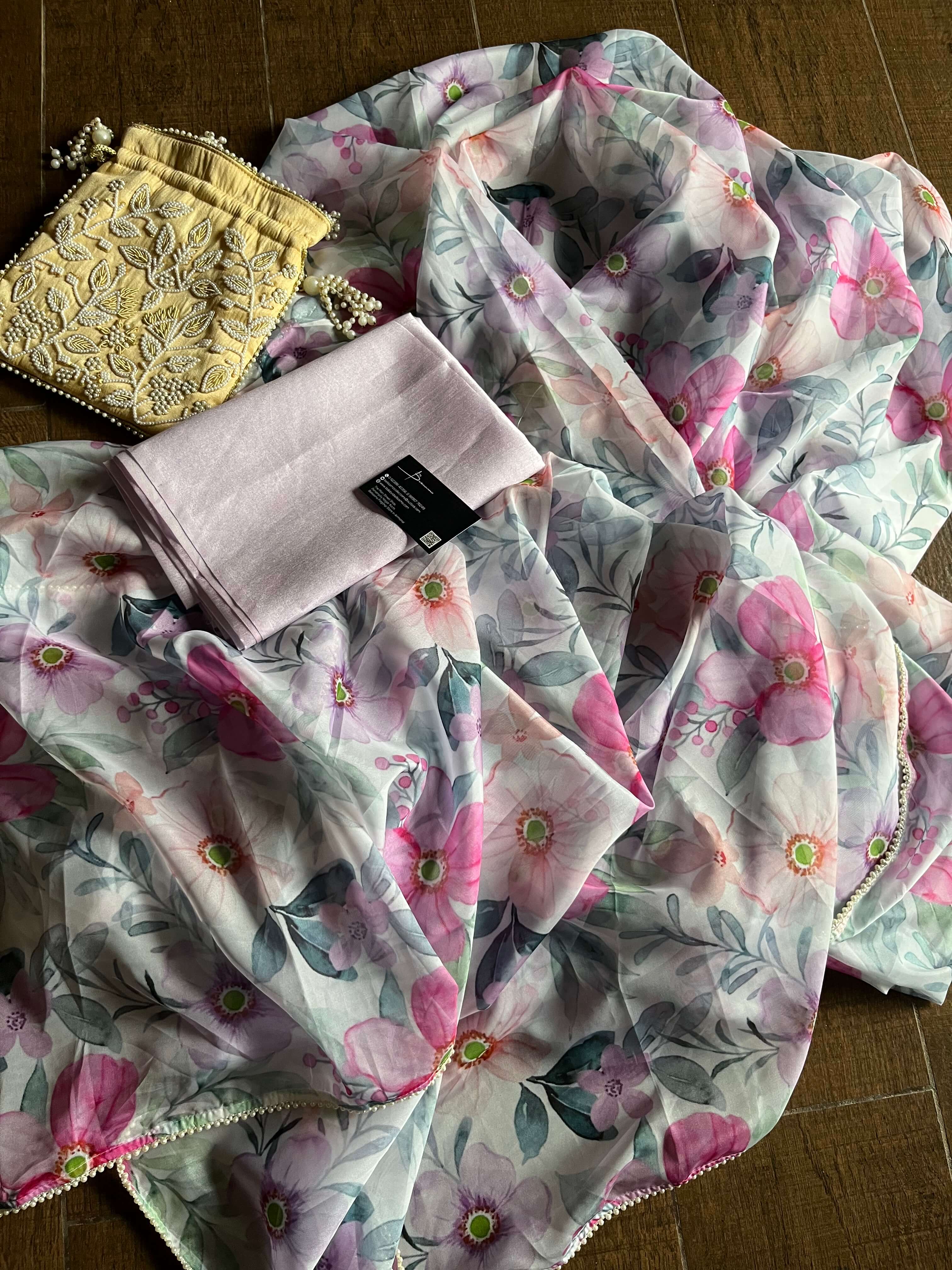 Organza Silk Saree With beads border. Blouse Silk Base.