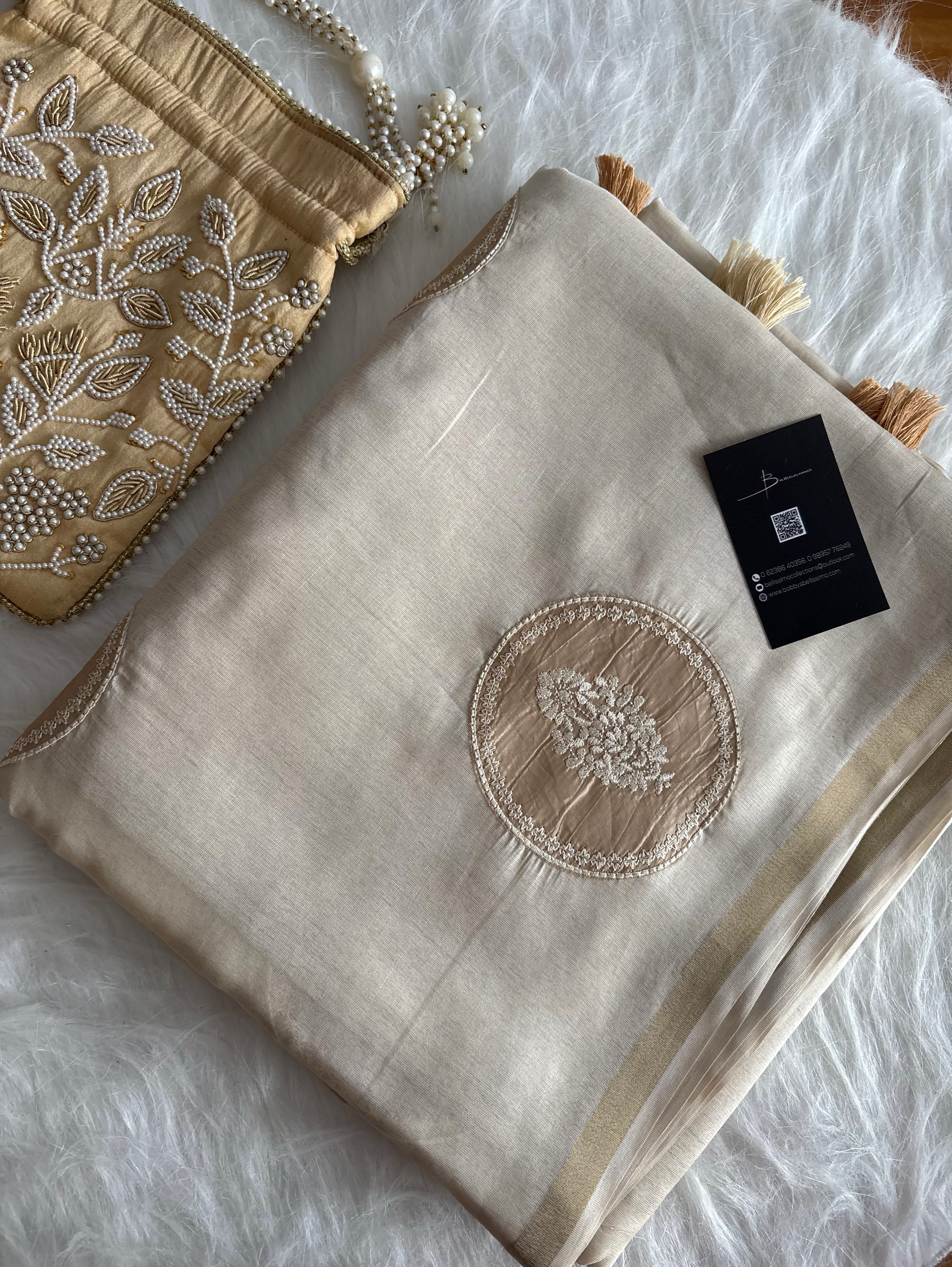 Our Tissue silk embroidered saree with rich pallu and delicate motifs all over — perfect for weddings and traditional occasions.